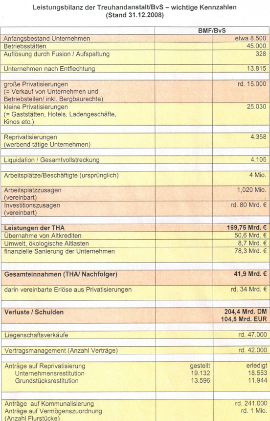 In diesem Dokument rechnet das Bundesfinanzministerium 2008 vor, wie viel die Treuhandanstalt durch die Privatisierungen, also den Verkauf von ehemaligen DDR-Staatsbetrieben eingenommen hat: 34 Milliarden Euro. Die Versteigerung der UMTS-Mobilfunklizenzen brachte im Jahr 2000 über 50 Milliarden Euro.