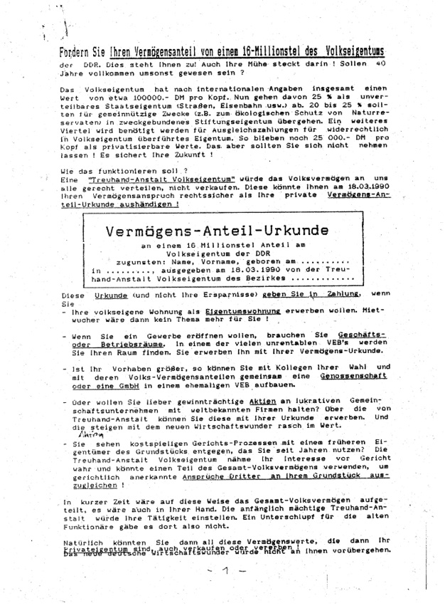 Die Gründung der Treuhand sollte nur ein ersten Schritt sein; die Anstalt sollte später „Vermögens-Anteil-Urkunden“ ausgeben, so der Plan einiger Bürgerrechtler. Unten der erste Entwurf eines solchen Scheins.